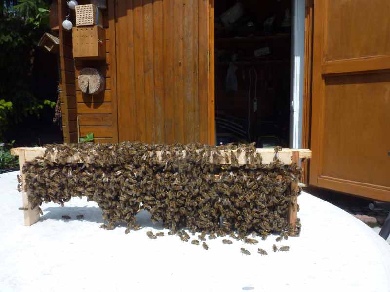 Am 8. Tag werden die Zellen gedeckelt und die überzähligen Zellen bekommen Schutzkäfige. Wenn keine Tracht mehr zu erwarten ist, werden bei dieser Aktion Bienenfluchten gesetzt und der Honig wird 1 bis 2 Tage später abgeholt. Mit den Bienen, die unter der Bienenflucht sitzen, kann man bei dieser Gelegenheit wunderbar einen Ableger als Kunstschwarm mit einer überschüssigen Zelle erstellen.